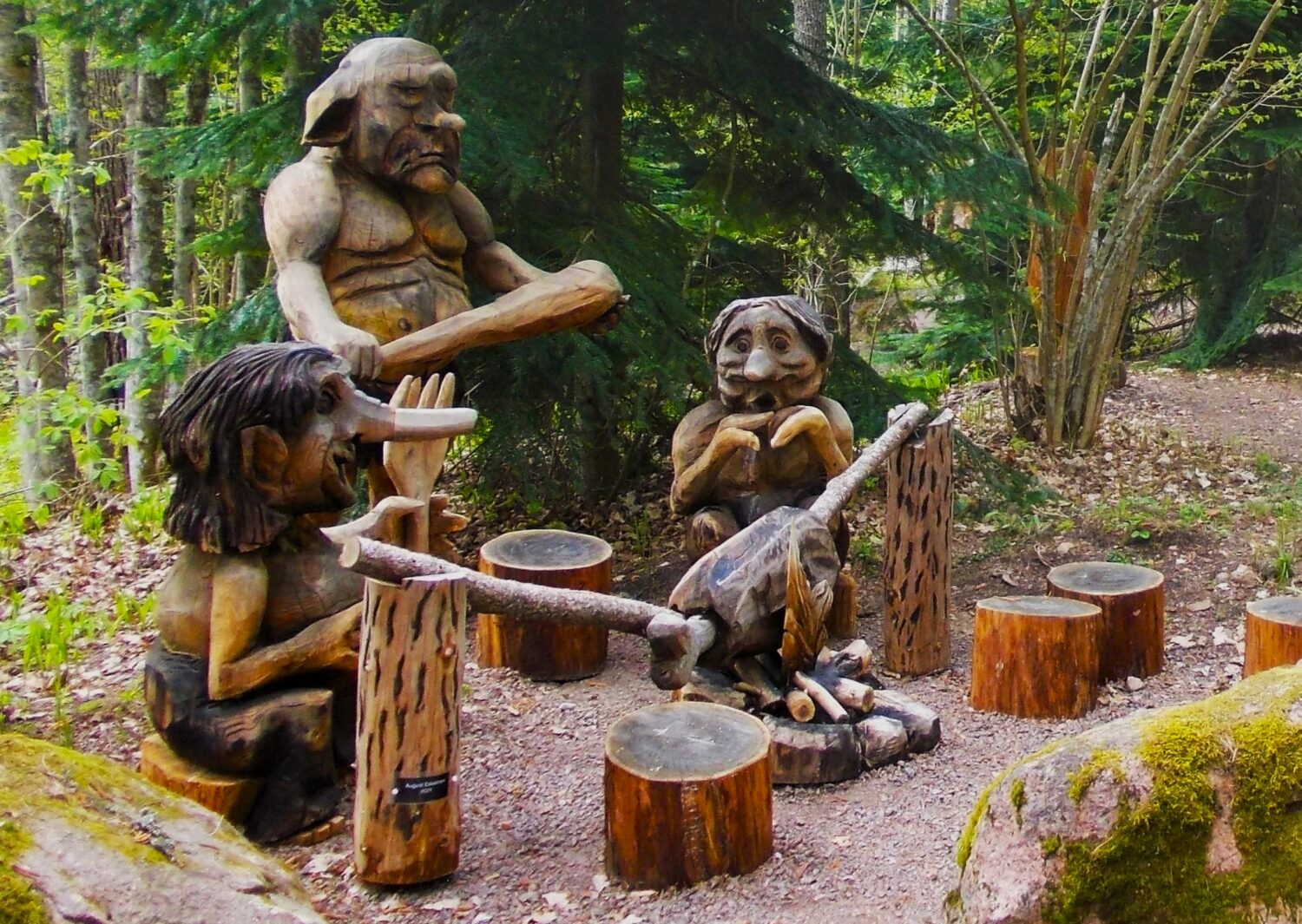Peikkoperhe-veistosryhmä Arboretum Mustilan Metsägalleriassa